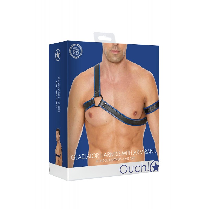 Composé de solides sangles réglables en cuir bleu surpiqué de cuir noir, le harnais "Gladiator Harness" convient à la majorité des hommes. Il se ferme grâce à une boucle solide dans le dos tandis qu'un large anneau sur le côté droit de la poitrine permet dy attacher facilement une laisse, des cordes, des chaînes, des menottes, ou tout ce que vous souhaitez.