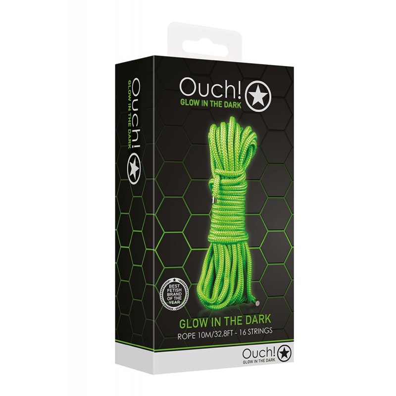 Pour les amateurs de bondage japonais, la marque Ouch! propose cette solide corde couleur vert fluo "Glow In The Dark" qui brille dans le noir, d'une longueur de 10 mètres, spéciale Shibari et jeux de bondage.