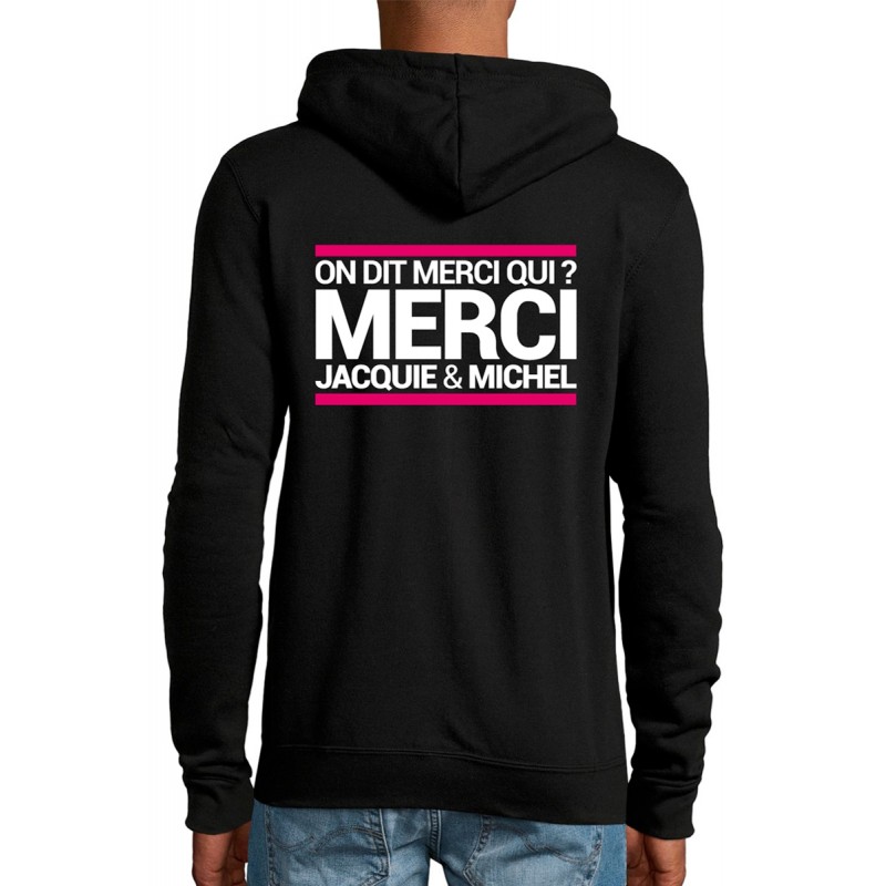 Faites vous plaisir et affichez vous en toute décontraction avec la veste à capuche noire J&M ornée dans le dos du slogan officiel de la marque : "On dit merci qui? Merci Jacquie et Michel".